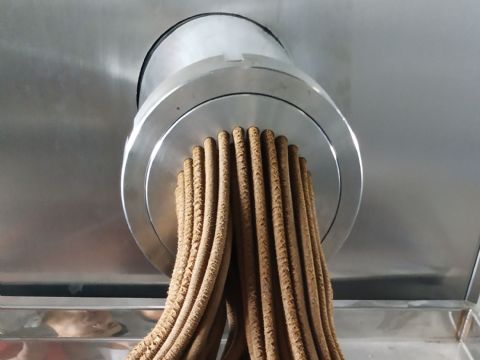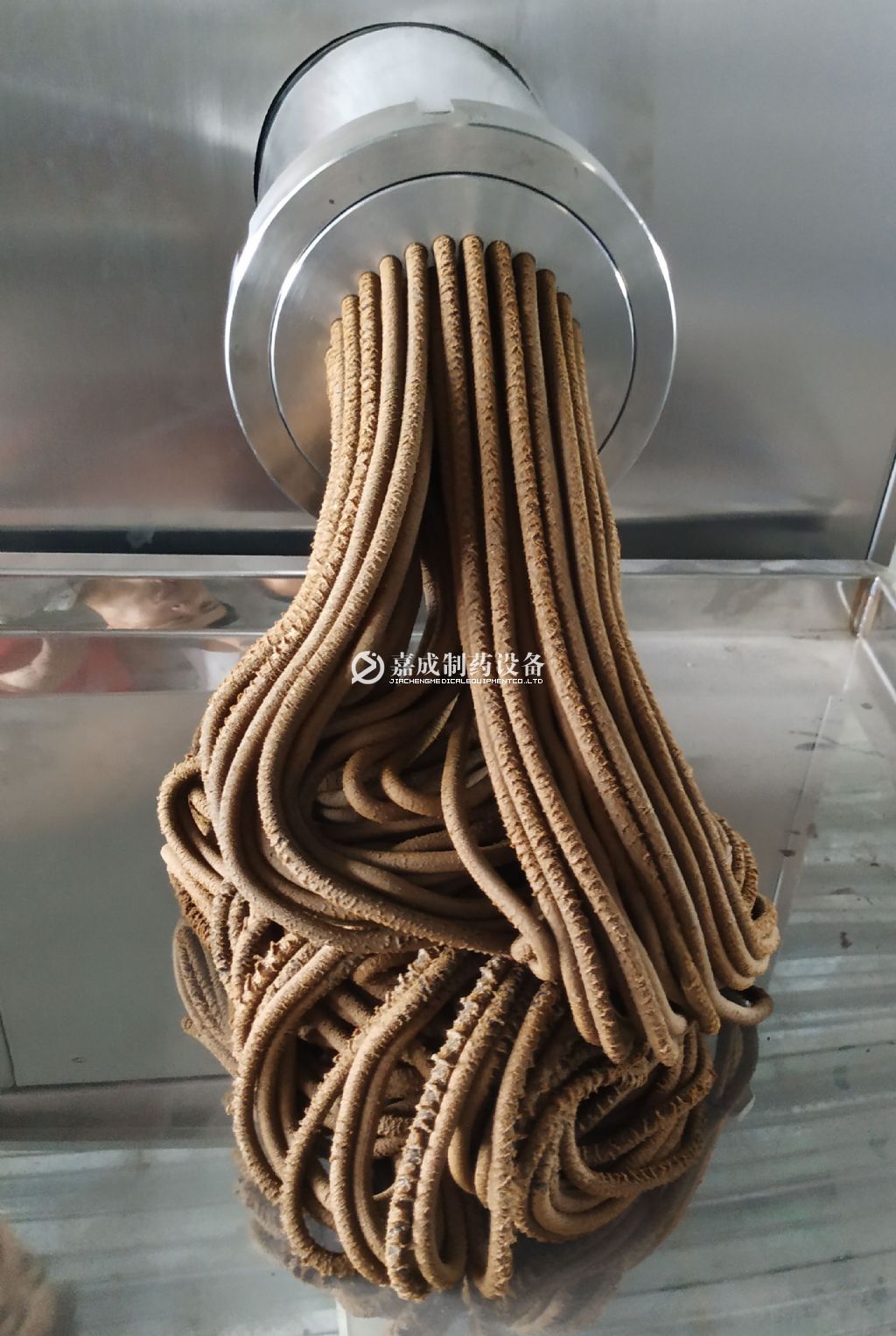 混合后的药坨,投入料口,在电动机的驱动下。喂料器叶片内旋压入螺旋槽内,并旋向机口,因药坨面积大于孔板的小孔面积而受阻时,药坨的致密性、温度、粘度相应提高,当机腔过饱和时,炼好的药坨从孔板的小孔连续挤出,供制丸生产使用。