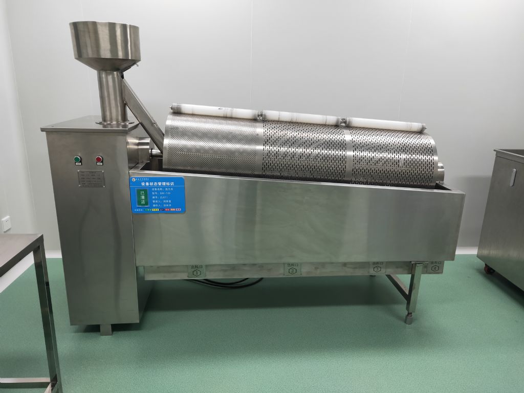 该机可单机使用也可与制丸机和提升机配套使用,提升机将成品药丸提升后经溜槽进入旋转的滚筒筛内,三节滚筒筛在主动摩擦胶轮的带动下,顺时针旋转,分别选出符合要求的各种丸剂。在筛选的过程中会出现丸剂直径正好与筛孔大小一致的情况,丸剂夹在筛孔上,这时安装在滚筒筛侧边的滚刷或硅胶压辊能将药丸挤出。