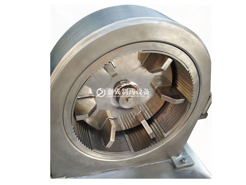 本机采用了风轮式高速旋转刀,定刀进行冲击、剪切研磨,粉碎时机腔内产生了强力的气流,把粉碎室的热量和成品一起从筛网流出,粒度大小通过更换筛网获得。